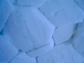 Après deux jours harassants, et à force de voir les deux petites buttes au loin, entre deux blizzards, nous décidons d’aller voir ces petites mottes de neige, repérées à notre arrivée. Ce n’est pas très loin, mais il y a un vent d’enfer. La neige craque sous nos pas, et le vent instantanément cache nos traces. Je me demande bien, en pensant à la personne disparue, comment quelqu’un peut survivre dehors, dans ces conditions, pendant une semaine. Finalement nous arrivons près des igloos, deux d’entre eux sont déjà tout ratatinés, mais on peut deviner que la neige qui les constitue s’est transformée en glace au fur et à mesure de leur utilisation. L’igloo gelé de neige est transformé en une coquille de glace incassable à l’intérieur.